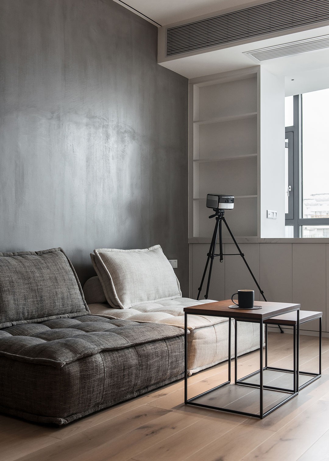 整个房间的色调用了灰色和木色,皮埃蒙特沙发、胡桃木桌等家具
