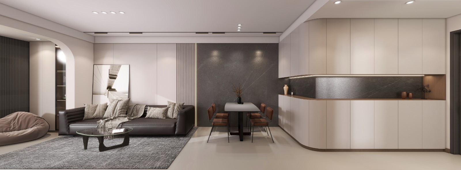 精心打造出一个空间,此空间兼具舒适性与功能性。空间主要以平实温厚的石材墙面奠定基调,软装设计汲取山色余晖的概念,与各种极富艺术气质的家具相互搭配,营造出一种柔和而不造作的空间氛围。