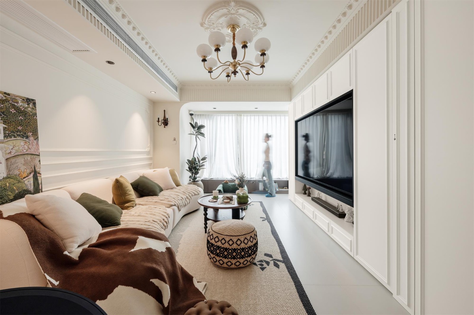 整个空间以奶油白为主色调,大面积留白的墙面宛若一张铺开的画布,其上勾勒着精致的石膏线条,以对称的几何构图演绎着法式美学的秩序与韵律。 阳台区域通过拱形门洞与客厅无缝衔接,不仅完美彰显出法式风优雅的调性,也在素净墙面上描绘出变幻的光影诗篇。