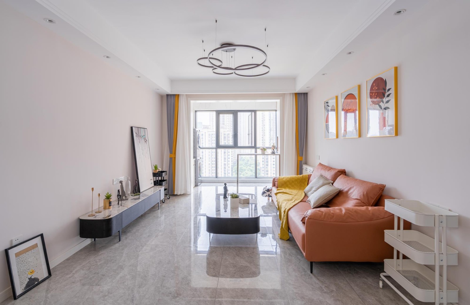 本案为竖厅户型,南北通透,采光优越。设计上化繁为简,摒弃繁复造型,采用简约边吊顶面,搭配一组圆形组合吊灯,以流畅线条勾勒视觉层次,简约中蕴藏细节。 电视墙摒弃复杂造型,仅以小巧精致的电视柜点缀,经典黑白配色历久弥新,呈现简约高端质感。