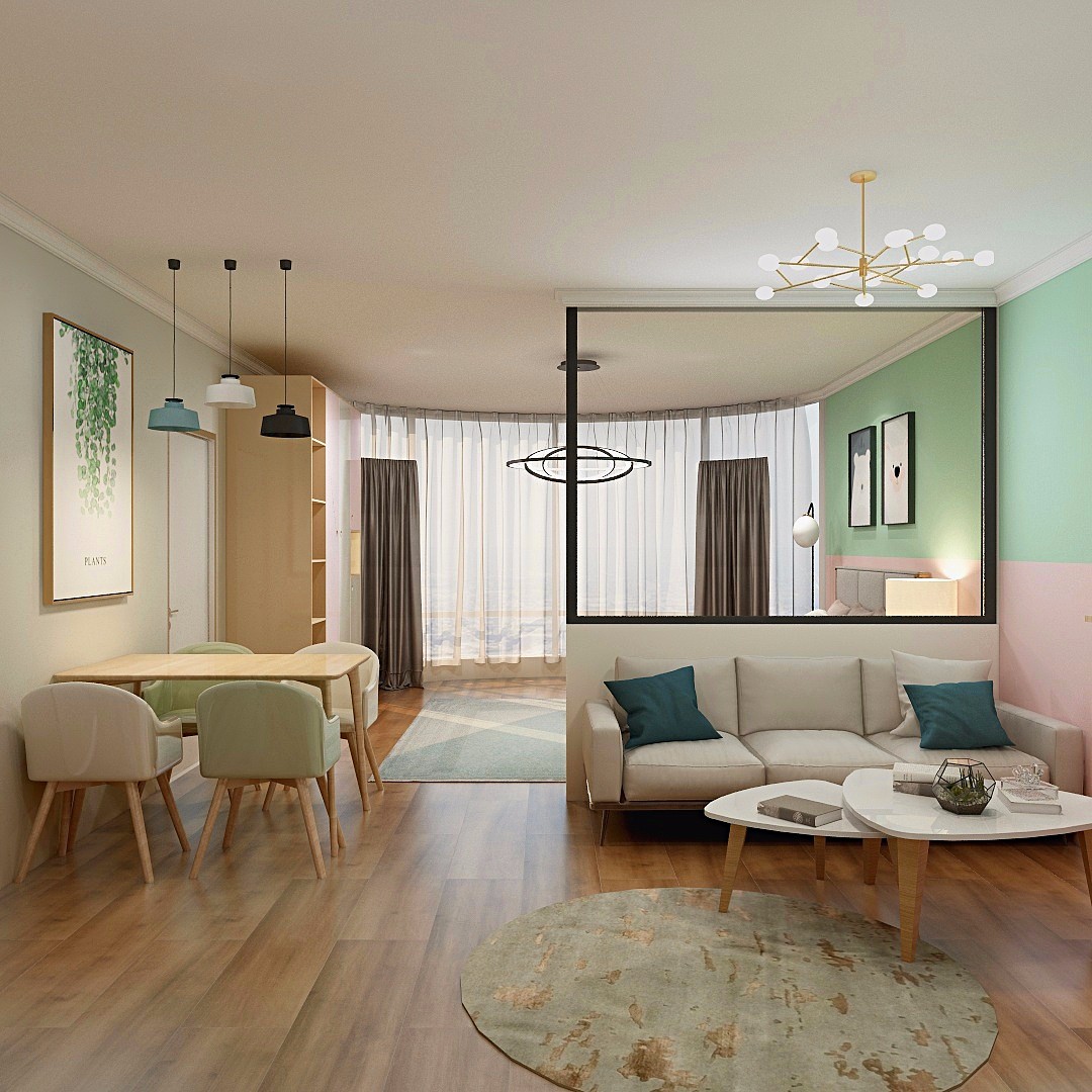客厅卧室隔开,保证私密性。背景墙采用彩色撞色,空间活跃灵动,不死板。