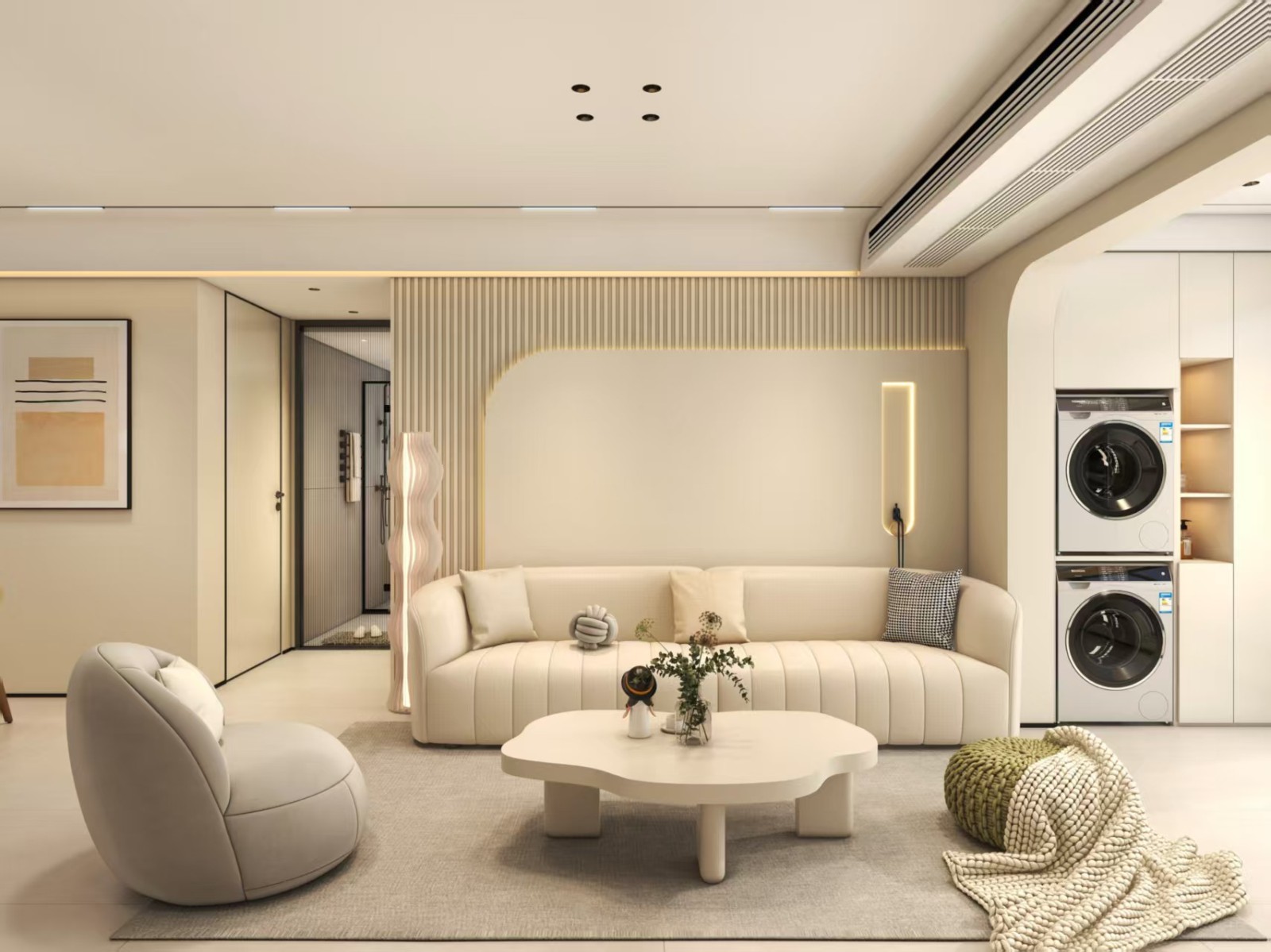 以柔和米色调为主,营造温馨治愈氛围。悬浮式奶油色沙发搭配造型独特的茶几,桌上绿植、小摆件增添生机。一侧单人休闲椅圆润可爱,地面浅灰地毯柔化空间。背景墙用弧形线条与格栅设计,结合灯带营造层次感。右侧嵌入叠放洗衣机,实现空间高效利用,整体简约舒适又具设计巧思,尽显精致生活格调 。